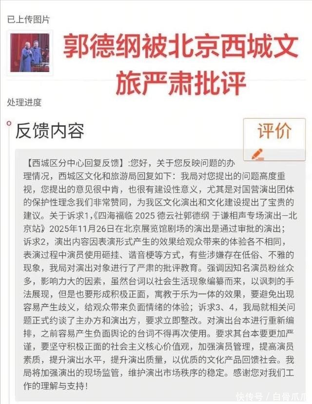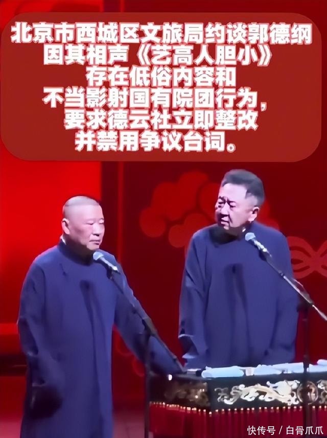 观众举报,官方回应于是不少网友涌入北京西城区文旅局,举报郭德刚《艺高人胆小》违背公序良俗,是对体制内文艺单位的污名化。